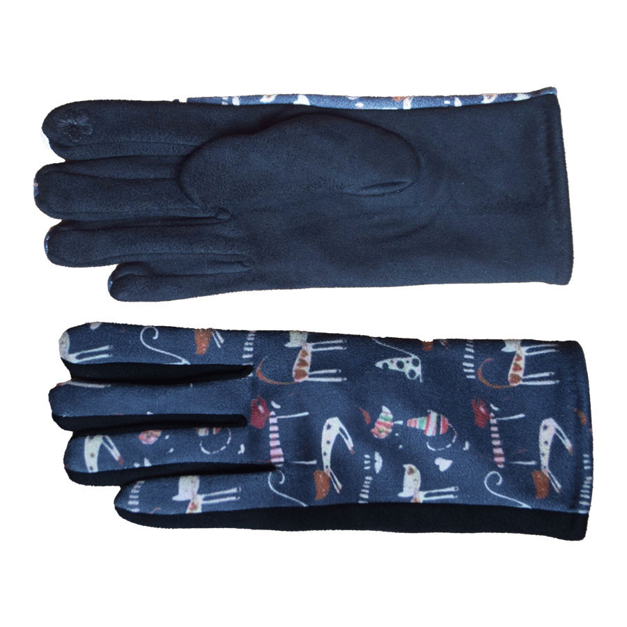 Embrace a chic and playful winter look with these dark blue suede gloves from Out Of Ireland, featuring a cat appliqué. These gloves are crafted from a soft, elegant suede-like fabric in a solid deep blue. The palm is simple and comfortable, while the back of the hand is enhanced with a charming grey cat head appliqué design, complete with a satin bow and an adorable little pom-pom. This accessory perfectly blends the sophistication of its color with the whimsy of its detail. Not only will they keep you warm, but their design is also touchscreen compatible, offering you modern comfort and practicality.