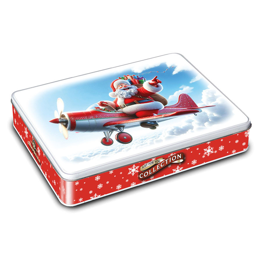 Presented in a festive 150 g tin, this special Christmas edition features a whimsical illustration of Santa Claus flying in an airplane loaded with gifts.