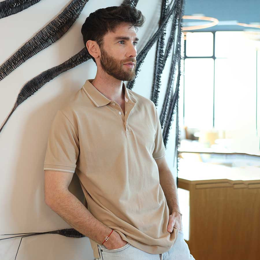 Short-sleeved polo shirt in sand.