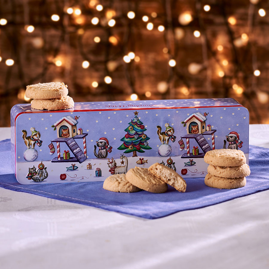 They are presented in a pretty embossed metal box illustrated with an adorable “cat Christmas party” theme.