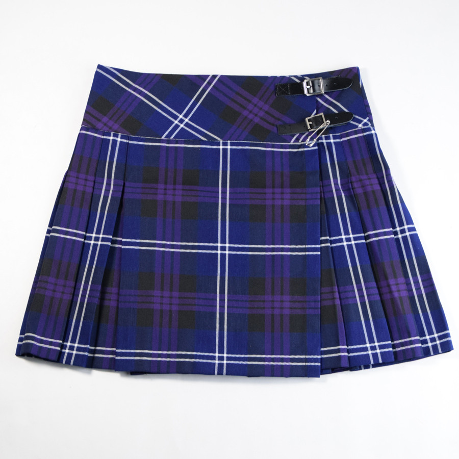 Closed by two metal buckles, this mini kilt in purple tartan can be worn as a skirt in summer and with tights in winter.
