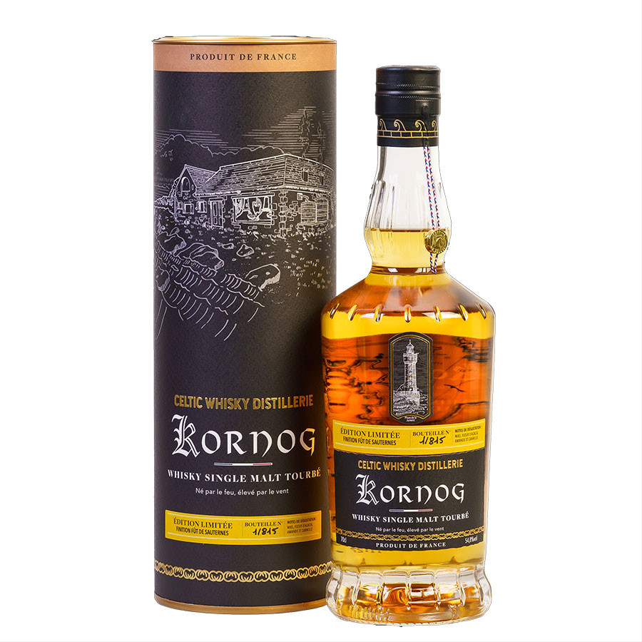 Kornog est un Singe Malt tourbé dont le processus d'élaboration est précis et minutieux. Afin d'offrir un whisky puissant, ce Kornog finition Sauternes a été embouteillé à son degré naturel de 54,8°.